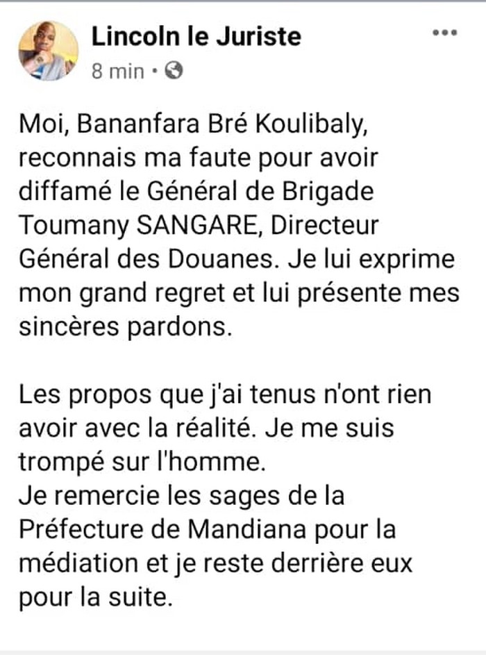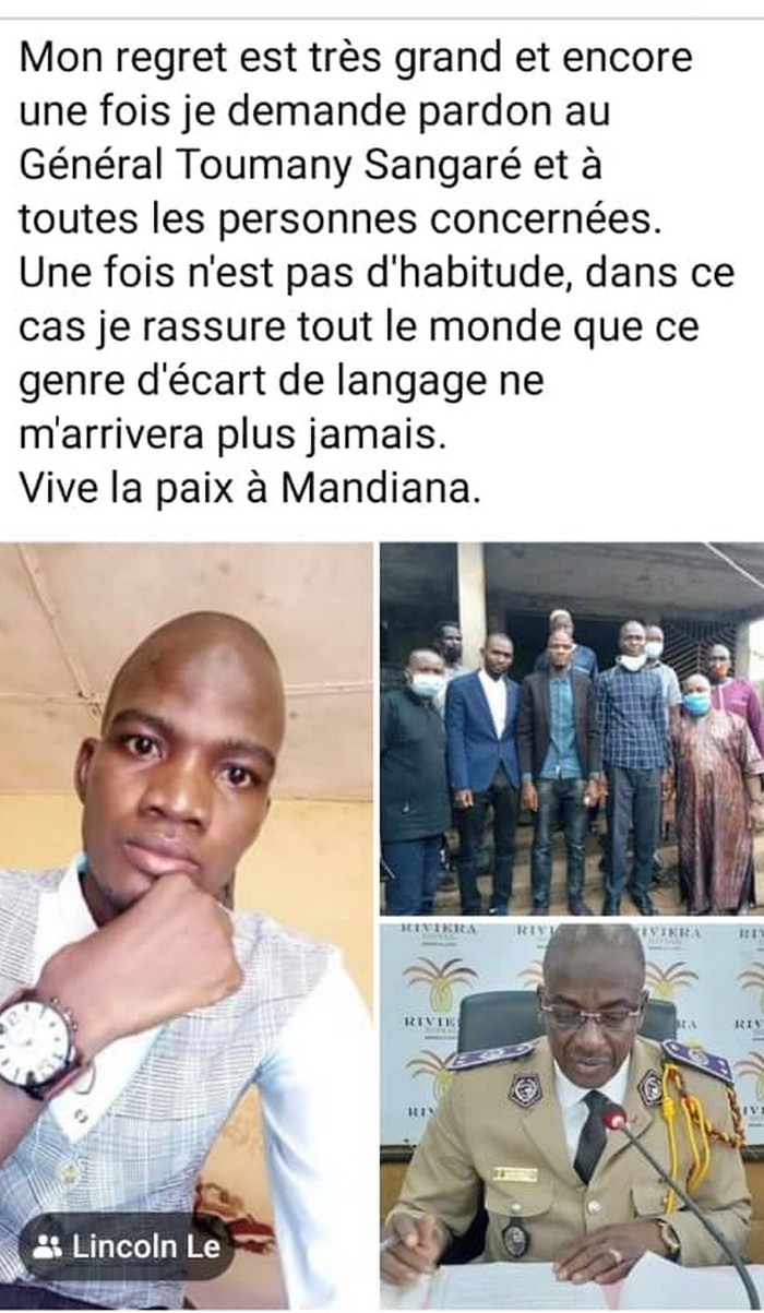 Sur le même réseau social Facebook, il a présenté ses excuses et dit s’être trompé sur la personne avant de remercier les sages de la préfecture de Mandiana qui ont intercédé auprès de la victime.