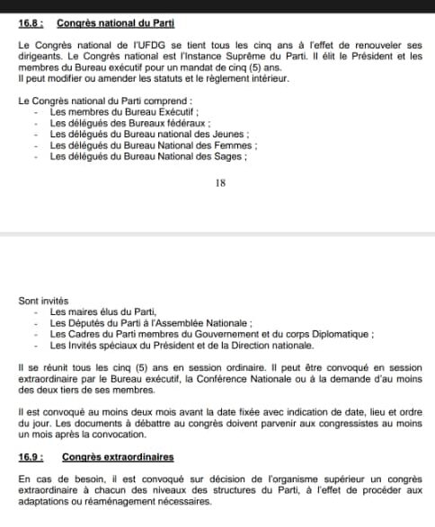 Les textes du parti UFDG (Union des Forces Démocratiques de Guinée) régissent de manière détaillée les modalités d’organisation et de participation au congrès national, notamment en ce qui concerne les critères pour se porter candidat à des postes au sein du parti, les conditions de participation, ainsi que le fonctionnement de ses instances dirigeantes.