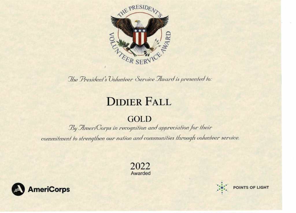 Mr Didier Dialor Fall Vient d’être distingué par un Awards du Président Américain Joe Biden pour service rendu à la communauté et à la nation américaine.